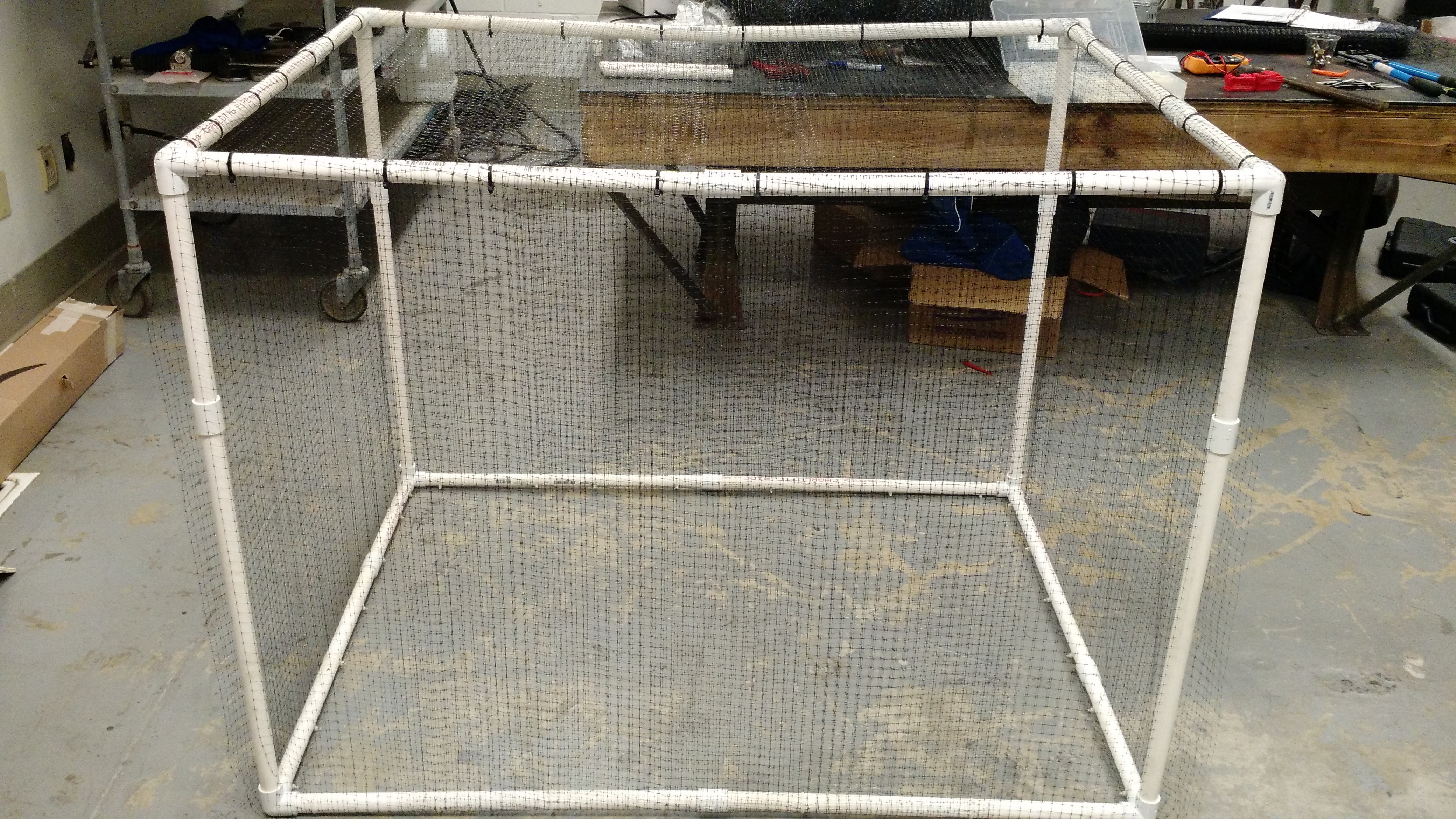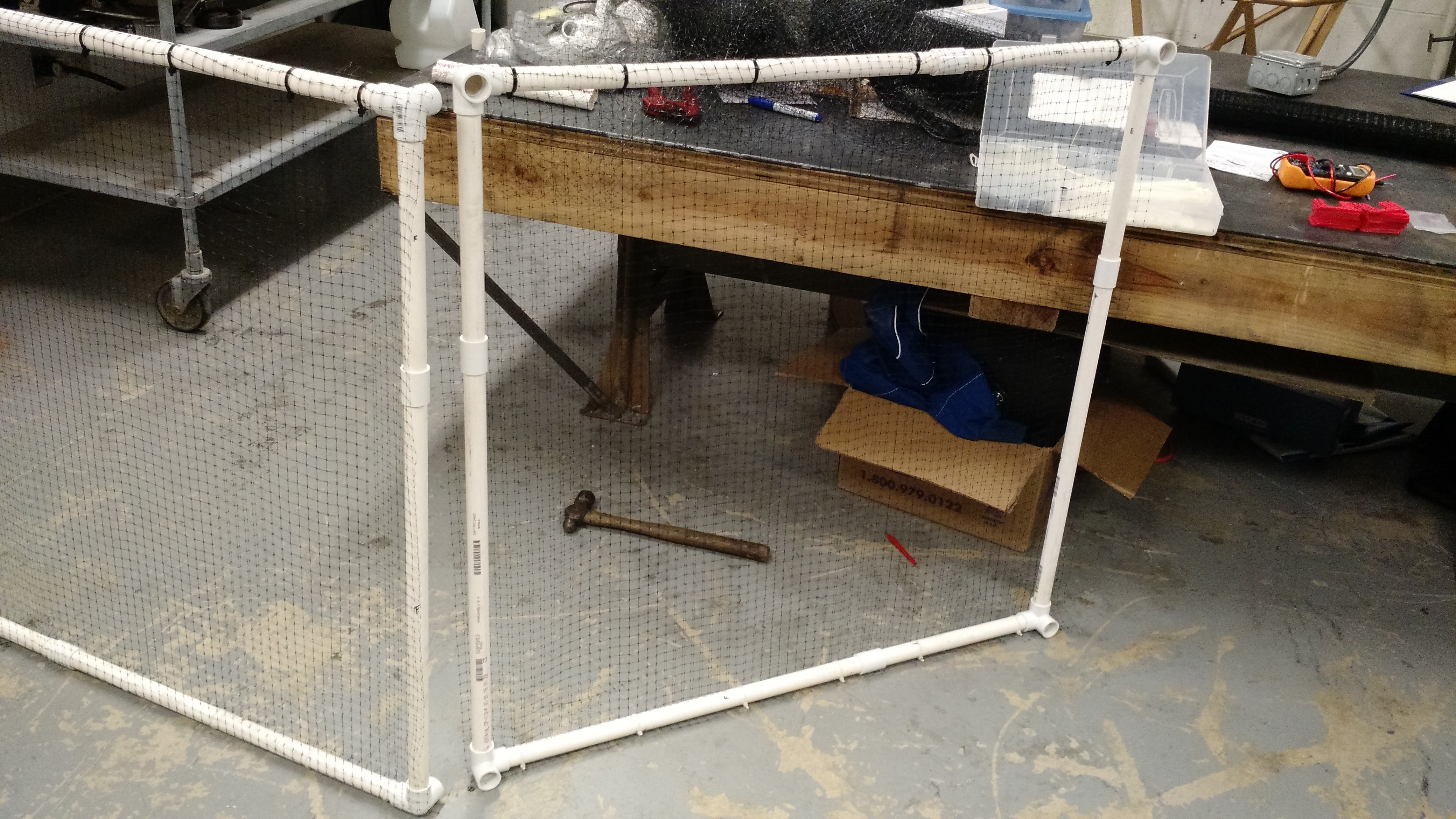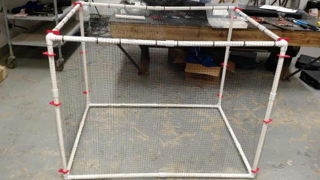 Description: I made a small drone cage from deer netting, PVC, and 3D printed clips. I designed the clips to tension the netting over the PVC frame. The components were labeled for easy assembly. This cage was used during drone presentations for people to try micro drones indoors.