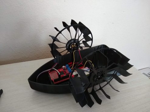 Description: After swimming with a friend we started to discuss how we propel ourselves through the water. We decided it would be fun to have a small RC boat to toy around with that paddles. Using my 3D printer, I designed the components in Solidworks and used some parts that I had lying around such as motors and an Arduino. I then designed an interface on my phone so that I could control the boat through bluetooth.